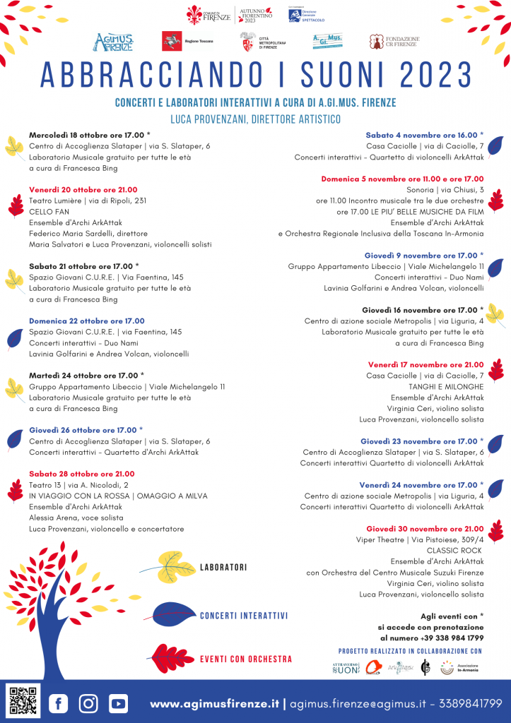 “Abbracciando i Suoni” è il nuovo progetto firmato A.Gi.Mus. Firenze inserito nella programmazione dell’Autunno Fiorentino promosso dal Comune di Firenze. Un progetto nato per portare la musica fuori dai teatri e trasformarla in uno strumento al servizio del sociale, della riqualificazione del territorio e del contrasto alle marginalità.