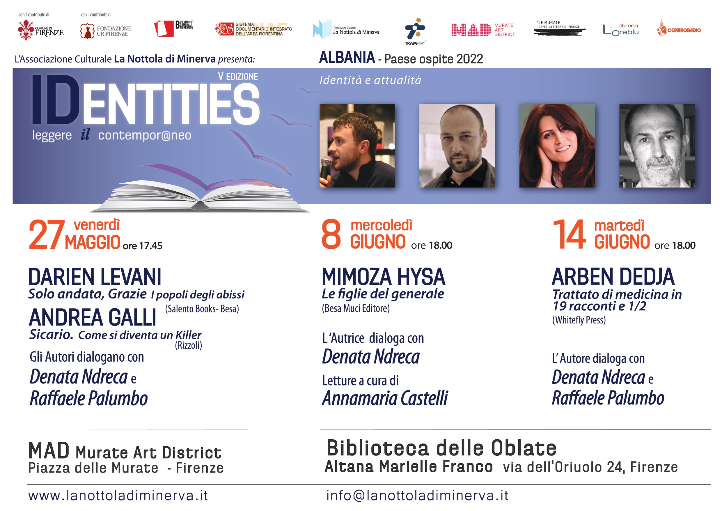 Nell'ambito della rassegna venerdì 27 maggio alle ore 17.45, presso MAD – Murate Art District, "Darien Levani - Solo andata, Grazie. I popoli degli abissi" (Salento Books - Besa) e "Andrea Galli - Sicario. Come si diventa un Killer" (Rizzoli). Gli autori dialogano con: Denata Ndreca scrittrice e giornalista albanese Raffaele Palumbo giornalista di Controradio.