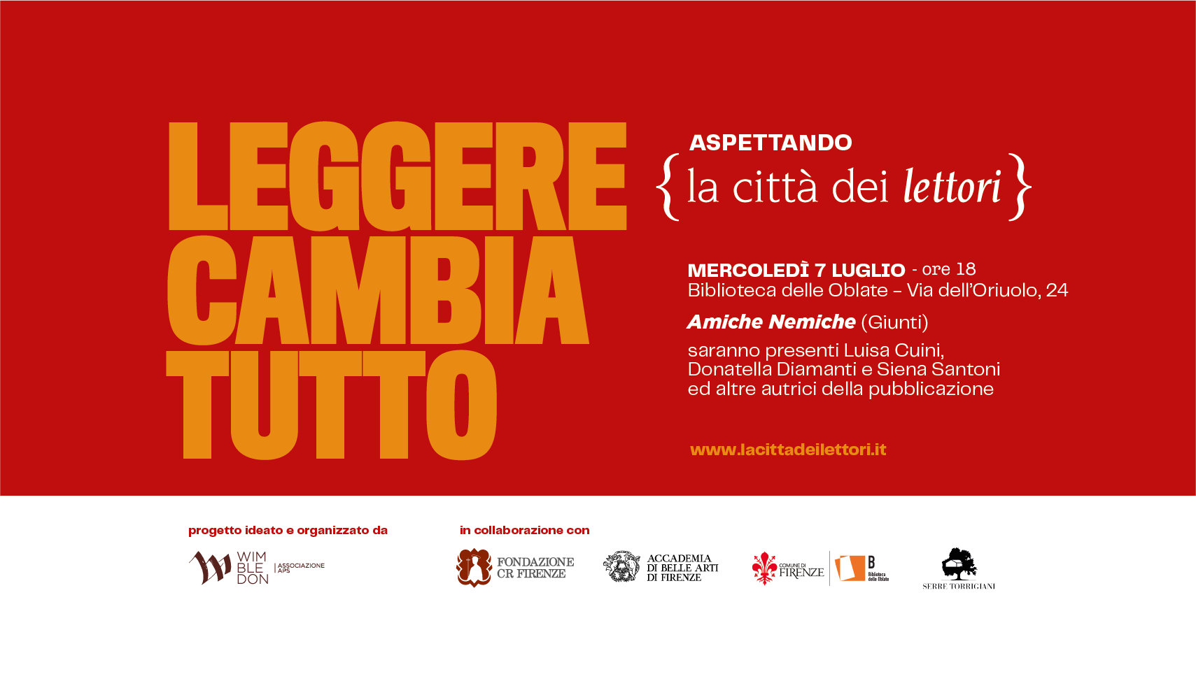 Gli appuntamenti di Aspettando La città dei lettori sono ideati e organizzati dall’Associazione Wimbledon APS, in collaborazione con la Fondazione CR Firenze, l’Accademia di Belle Arti di Firenze, le Biblioteche Comunali Fiorentine e Serre Torrigiani.
