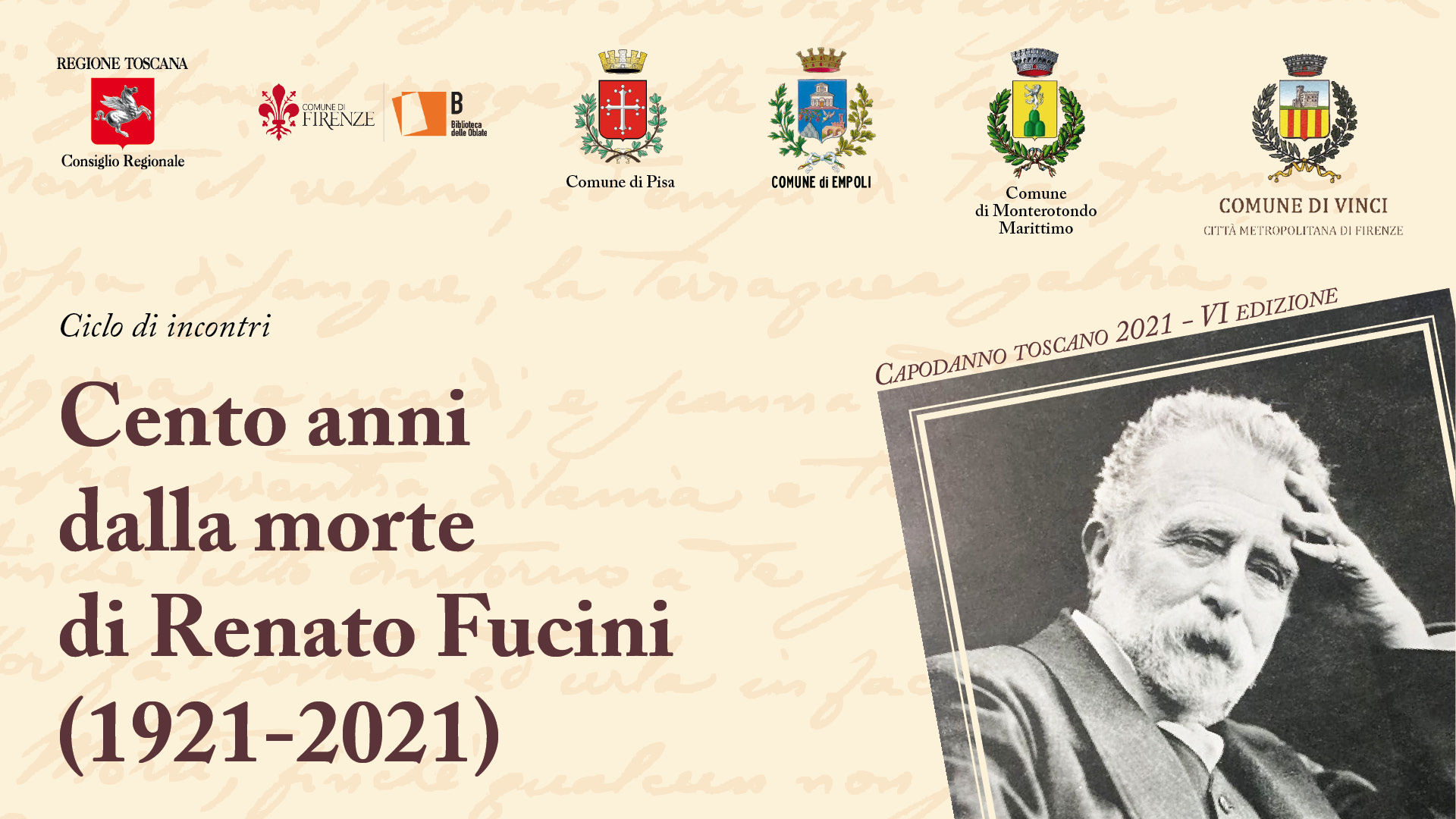 In occasione del Capodanno toscano il Consiglio regionale della Toscana, in collaborazione con i comuni di Firenze, Empoli, Monterotondo, Pisa e Vinci, promuove quattro appuntamenti per commemorare lo scrittore Renato Fucini nel centesimo anniversario della sua scomparsa (1921 – 2021) nei luoghi più significativi della sua vita.