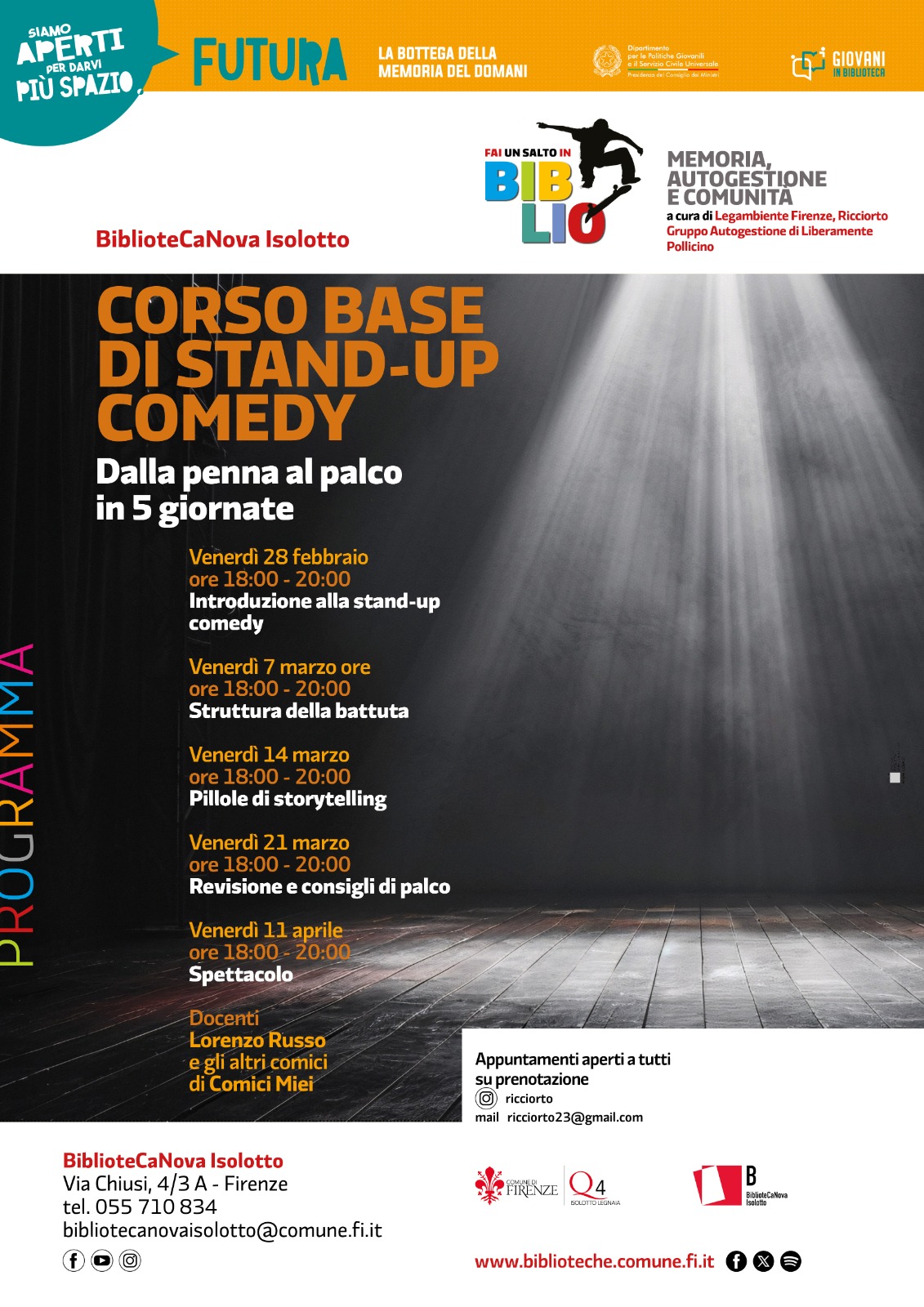 Il corso fa parte del progetto “Futura. La bottega della memoria di domani”, realizzato all'interno del programma “Giovani in biblioteca” finanziato dal Dipartimento per le Politiche Giovanili della Presidenza del Consiglio dei Ministri.
