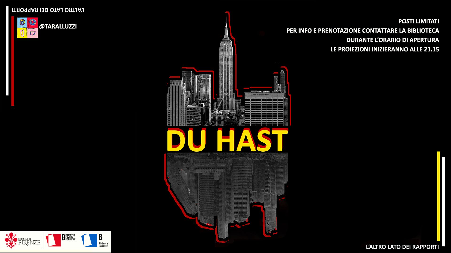 Le proiezioni si tingono alle ore 21.15 nell'agorà della Biblioteca Mario Luzi e sono a cura dei Taralluzzi Amici della Luzi.