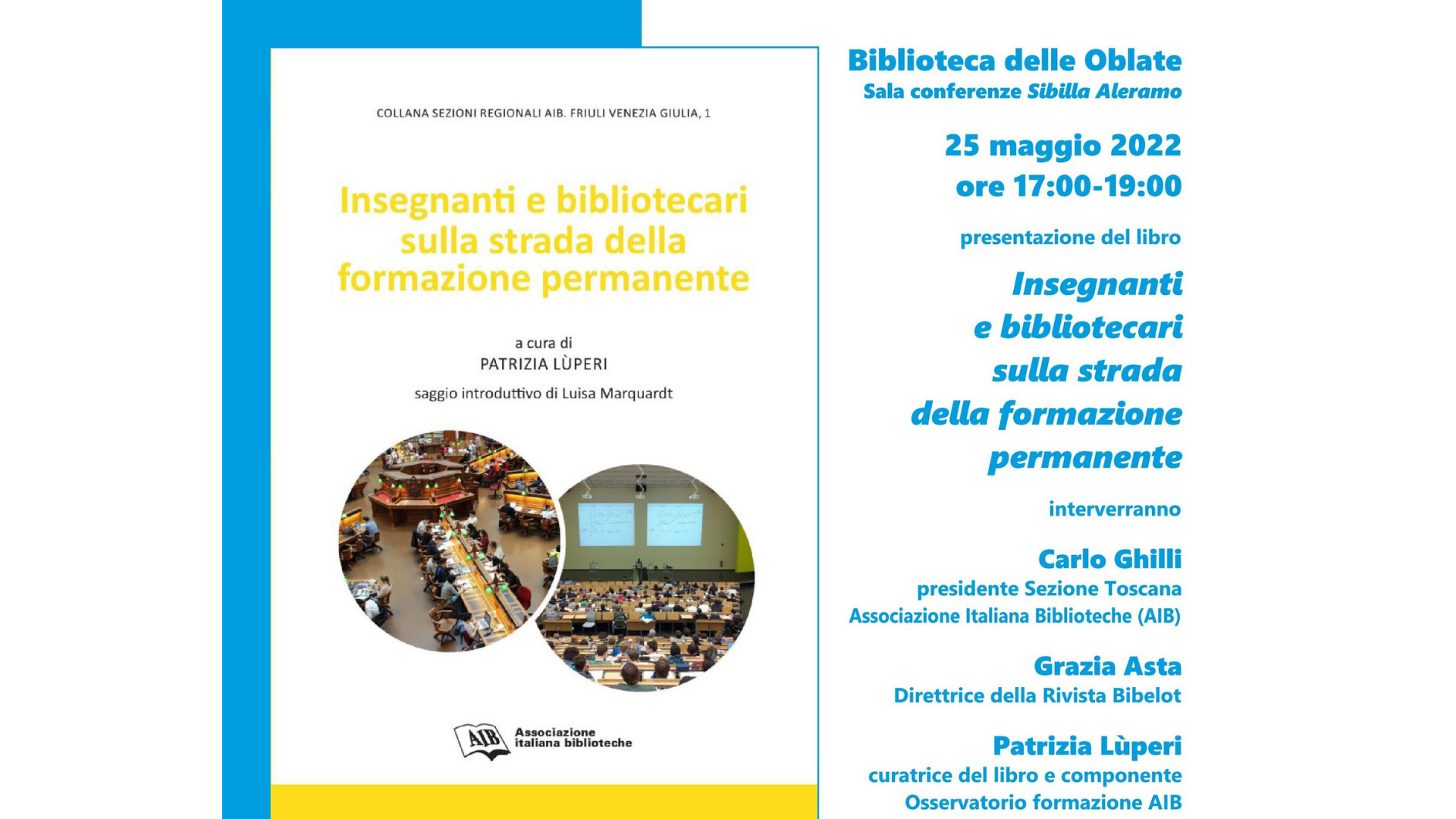 Nell'ambito dei festeggiamenti per il 15° compleanno della Biblioteca delle Oblate, nella Sala Conferenze Sibilla Aleramo alle ore 17 di mercoledì 25 maggio sarà presentato il libro "Insegnant e bibliotecari sulla strada della formazione permanente", a cura di Patrizia Lùperi (Roma: Associazione Italiana Biblioteche, 2021 - Collana Sezioni Regionali AIB. Friuli Venezia Giulia, 1).