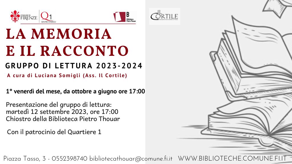 Il gruppo di lettura “La memoria e il racconto” è un appuntamento storico della Biblioteca Thouar, nato in collaborazione con l’associazione SocioCulturale “Il Cortile”, ai tempi della vecchia sede di Piazza Santo Spirito.