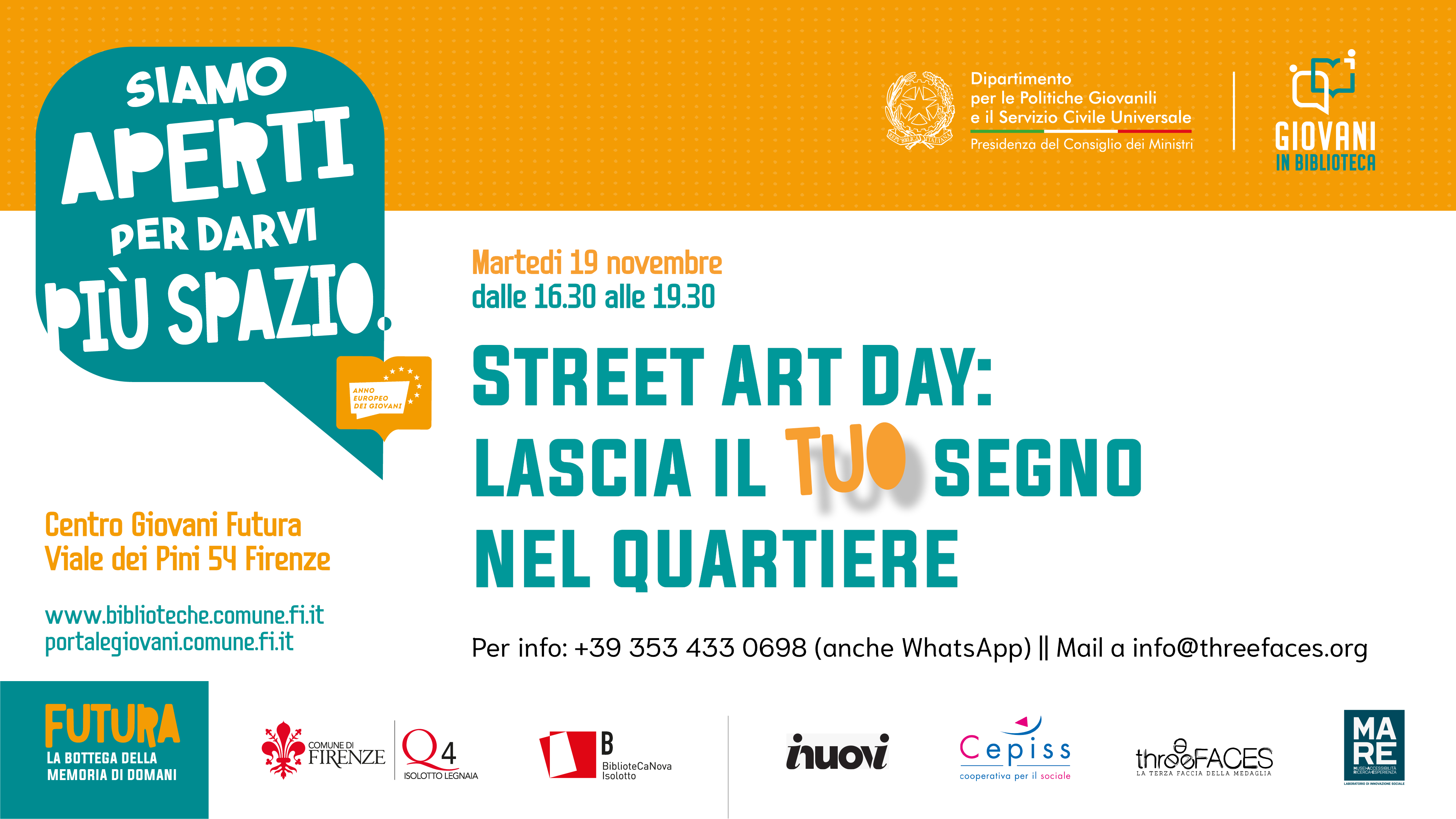 Martedì 19 novembre, presso il Centro Giovani Futura in Viale dei Pini 54, si terrà il Street Art Day, un evento dedicato ai ragazzi e alle ragazze del Quartiere 4 di Firenze, con l'obiettivo di promuovere la creatività giovanile attraverso l'arte urbana. L'evento si svolgerà dalle ore 16:30 alle ore 19:30 e offrirà ai partecipanti la possibilità di esprimersi artisticamente su pannelli messi a disposizione, utilizzando bombolette spray e vernici fornite gratuitamente.