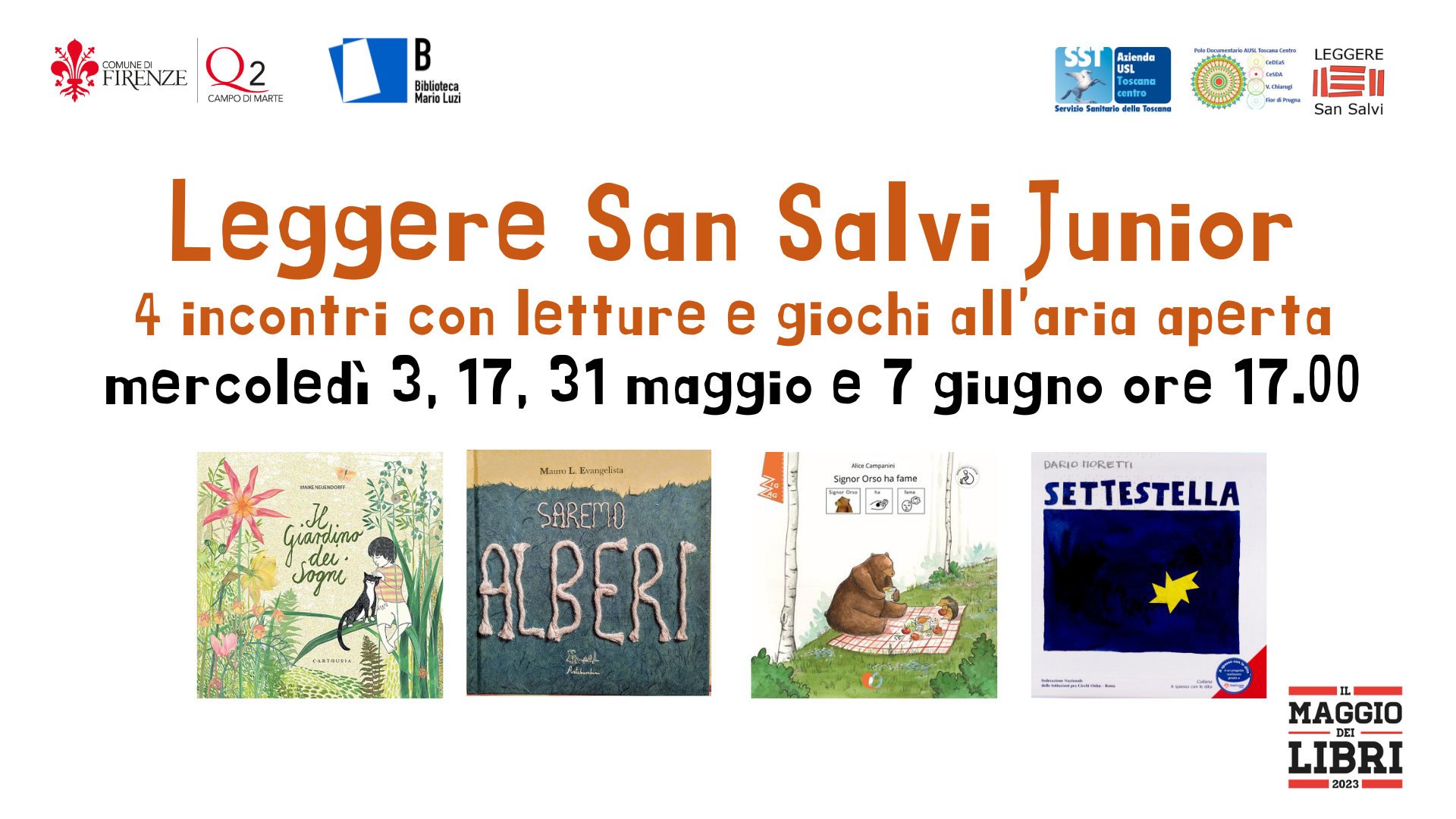 Il Polo Documentario AUSL TC e la Biblioteca Mario Luzi presentano “Leggere San Salvi Junior”, ciclo di 4 incontri con letture e giochi all’aria aperta. Ogni incontro è aperto alle bambine e ai bambini dai 3 ai 6 anni accompagnati da un familiare e prevede la lettura di una storia tratta ogni volta da un testo di diversa tipologia: silent book, albi illustrati, CAA e libri tattili con testo alfabetico e in braille, e, di seguito, un laboratorio ludico espressivo per tutti e tutte, adulti e bambini insieme.