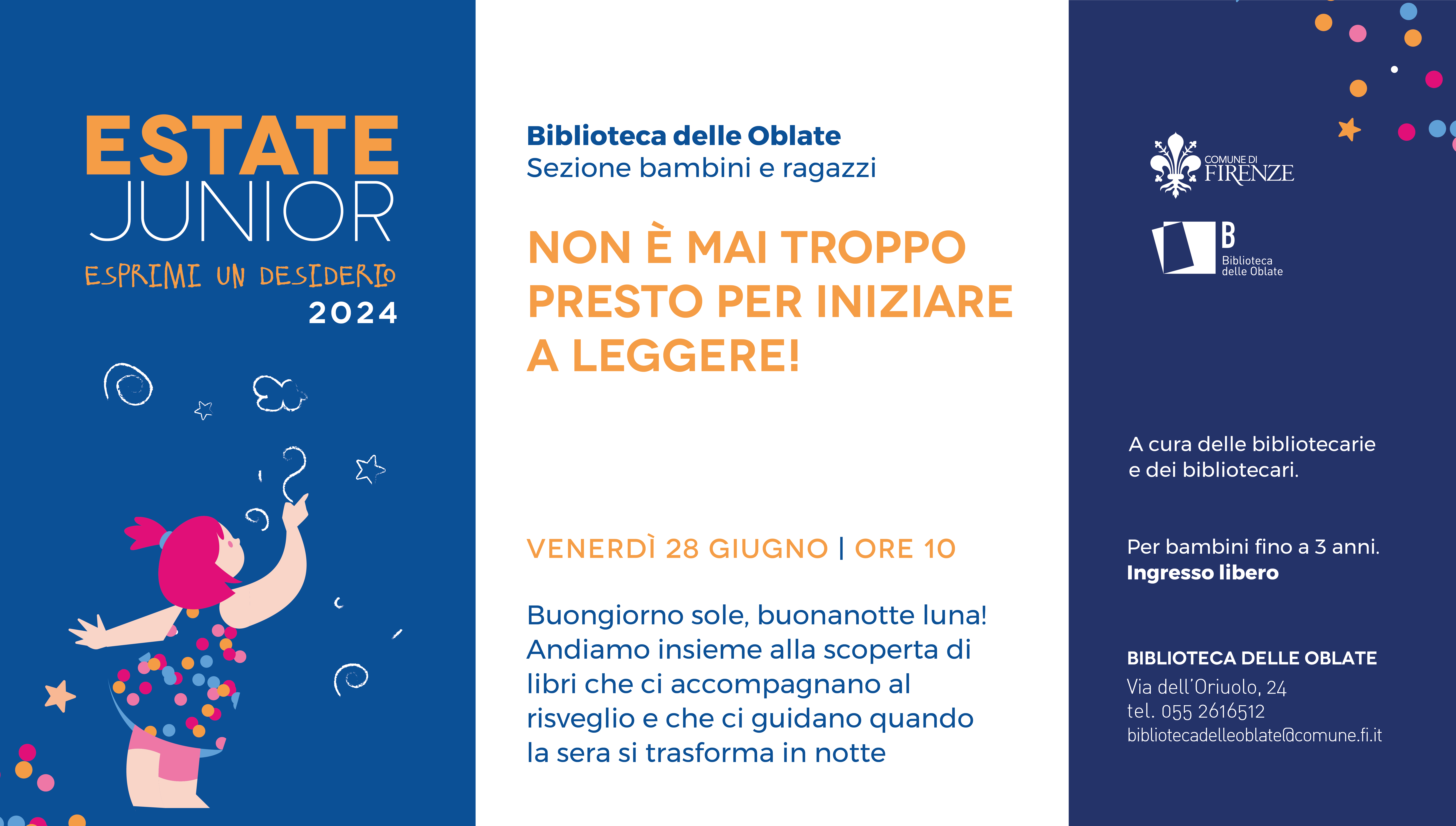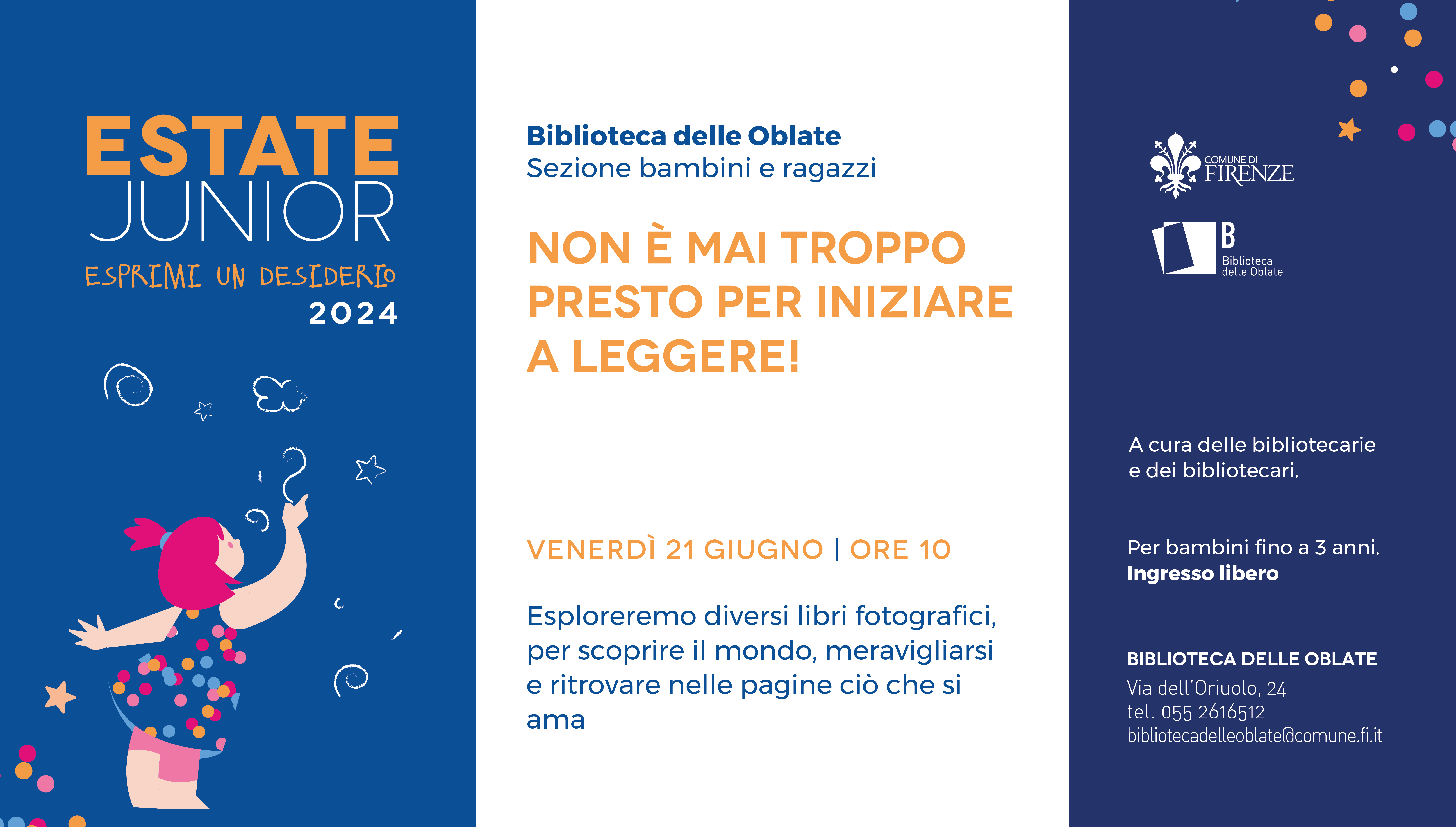 All'interno del programma di Estate Junior 2024, la Biblioteca delle Oblate organizza un ciclo di due incontri dedicato ai più piccoli della fascia d'età 0-3 anni, ai loro genitori, nonni e tate.