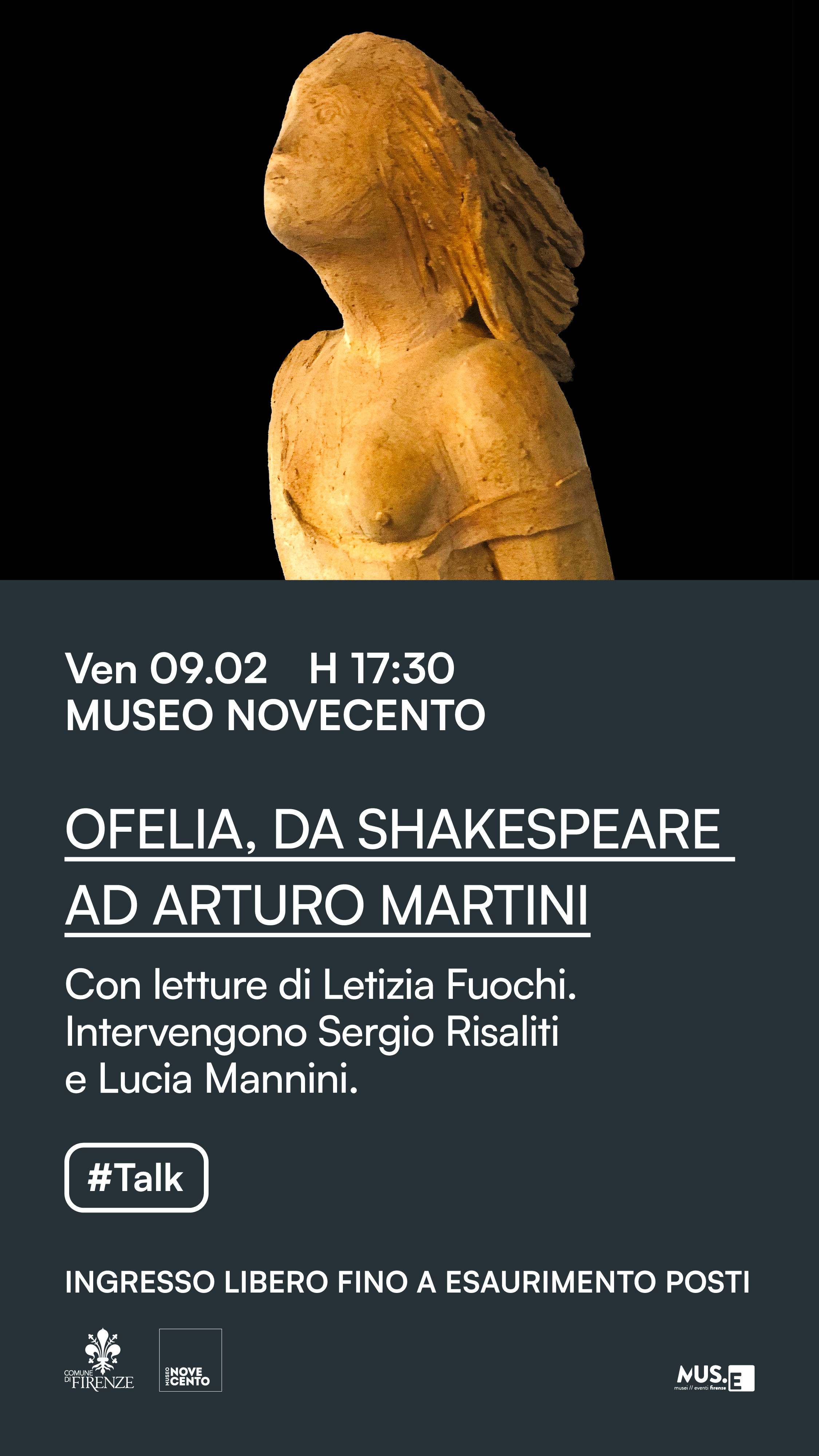 Al Museo Novecento un incontro che orbita intorno alla paradigmatica figura di Ofelia, un dialogo che va da Shakespeare ad Arturo Martini. Nel talk intervengono Sergio Risaliti e Lucia Mannini, impreziosito dalle letture di Letizia Fuochi.