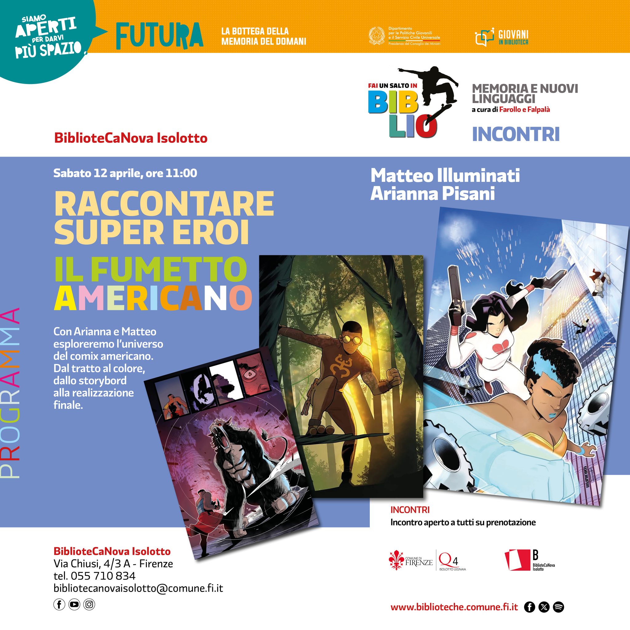 Insieme agli illustratori Arianna Pisani e Matteo Illuminati esploreremo l'universo del comics americano: dal tratto al colore, dallo storyboard alla realizzazione finale.