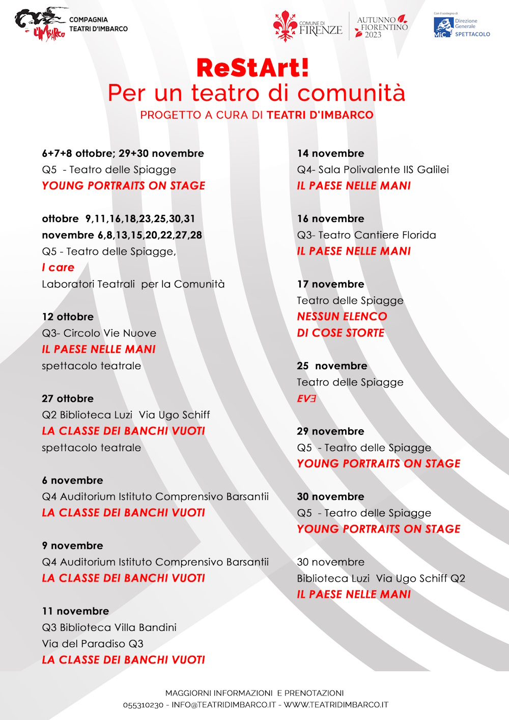 Cuore creativo del progetto, il Teatro delle Spiagge, residenza artistica della compagnia Teatri d’Imbarco, alle Piagge, per anni simbolo di certo disagio socioculturale. Da qui si dipaneranno attività in altri quartieri della città, in un’ideale “carovana dei diritti” declinata in una serie di eventi volti ad indagare l’arte come strumento di conoscenza e di resistenza (alla guerra, all’illegalità, all’ingiustizia).