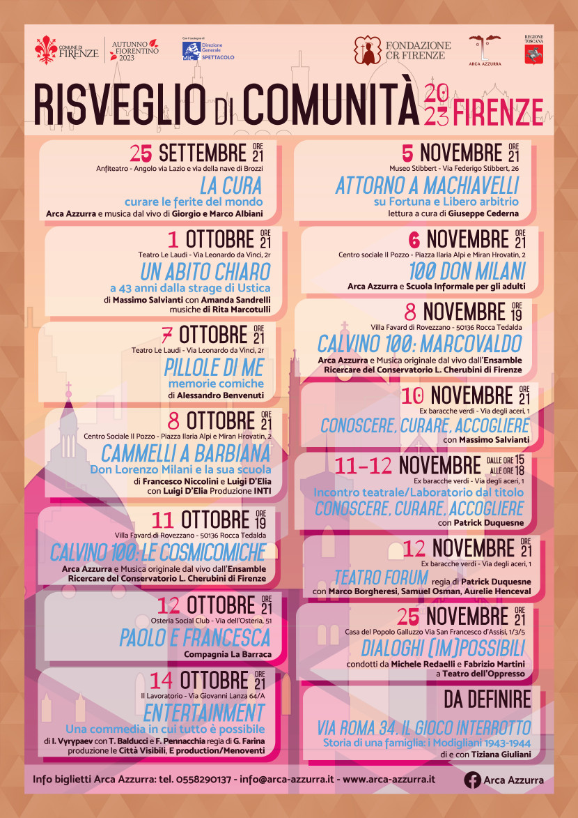 "Risveglio di comunità 2023: curare la memoria" attraversa 4 dei 5 quartieri fiorentini, mirando a rafforzare l’offerta culturale e spettacolare soprattutto dove più carente valorizzando luoghi di socializzazione anche non teatrali; rendere la comunità parte attiva di un processo culturale e creativo tramite incontri e laboratori; far germinare competenze artistiche e tecniche grazie a un confronto con professionisti di esperienza ed eccellenza e all’interazione di questi con operatori culturali che già intervengono sul territorio.
