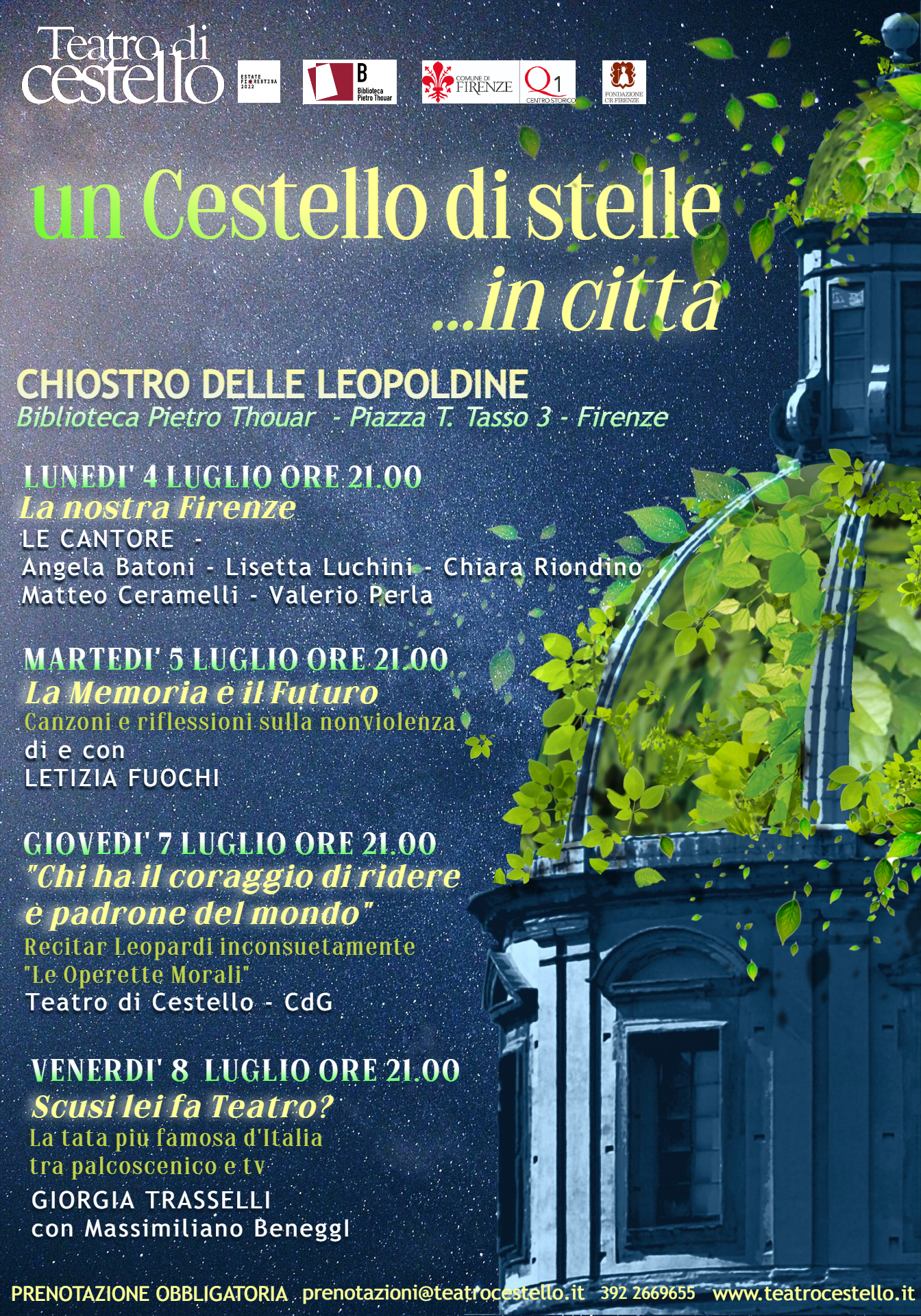 Su prenotazione scrivendo a prenotazioni@teatrocestello.it - o telefonando al numero 3922669655. Info e dettagli delle prenotazioni : http://www.teatrocestello.it/estate-fiorentina-2022/