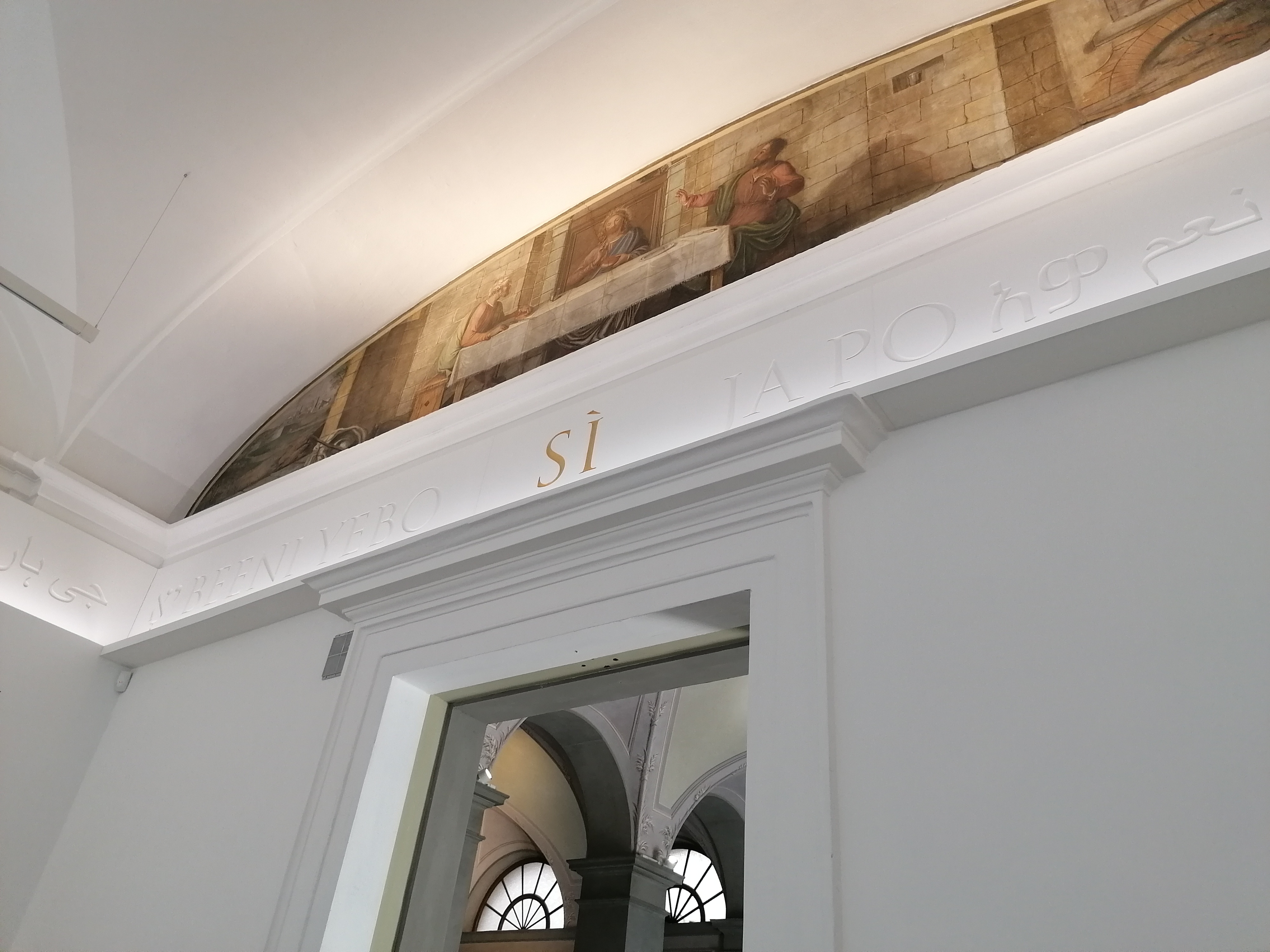 La prima sala è arricchita da un fregio che attorno al , nella cui sonorità già Dante sintetizzò espressivamente i caratteri della lingua italiana, allinea le differenti forme dell’affermazione in numerose lingue del mondo.