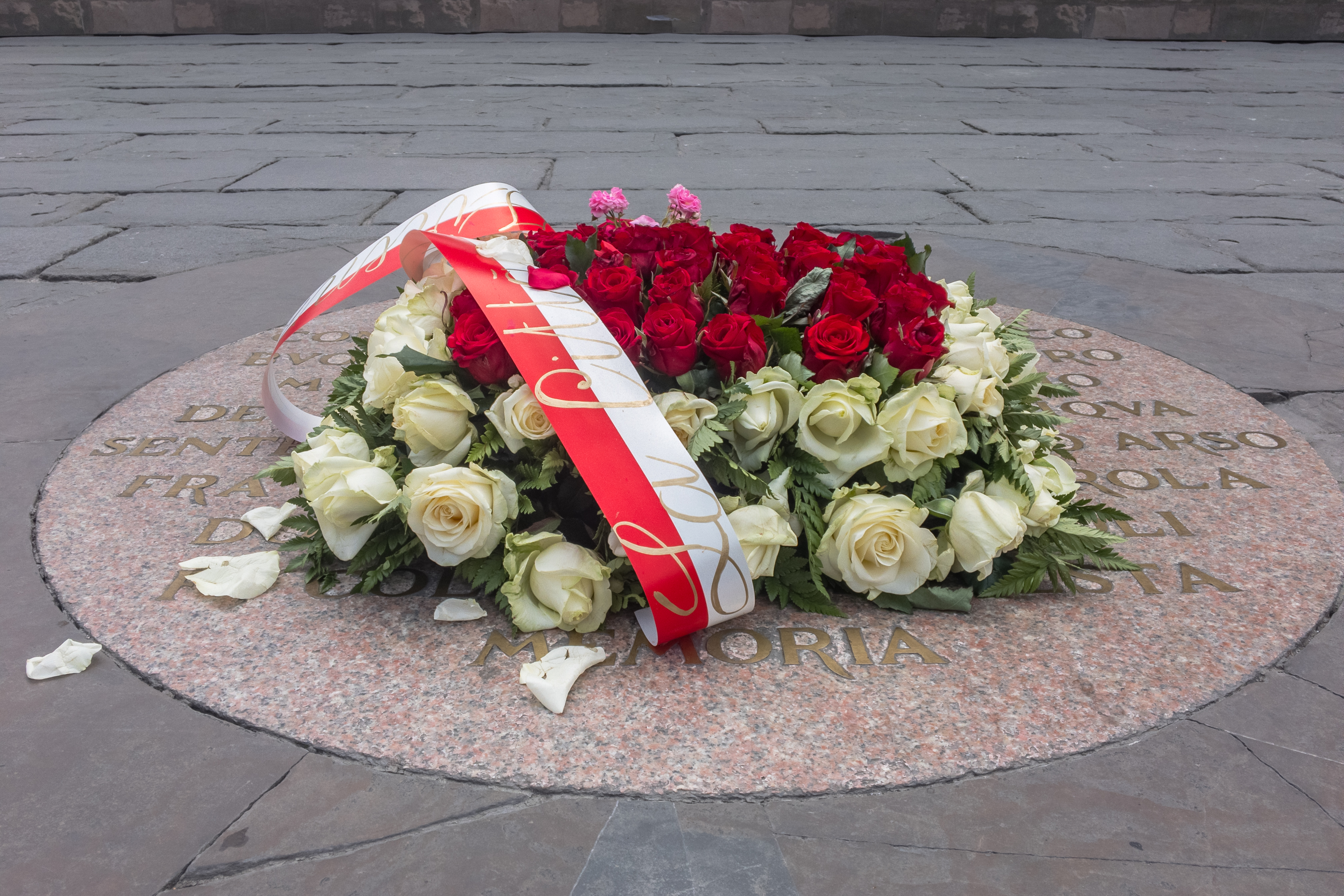 La mattina successiva, sul luogo del rogo (identificabile ancora oggi attraverso una lapide commemorativa in granito rosso) veniva rinvenuto un tappeto di fiori, un omaggio che qualcuno aveva voluto allestire con amore e tenerezza, quasi per riportare alla luce quell’umanità che l’orgia di violenza appena consumata pareva aver oscurato.