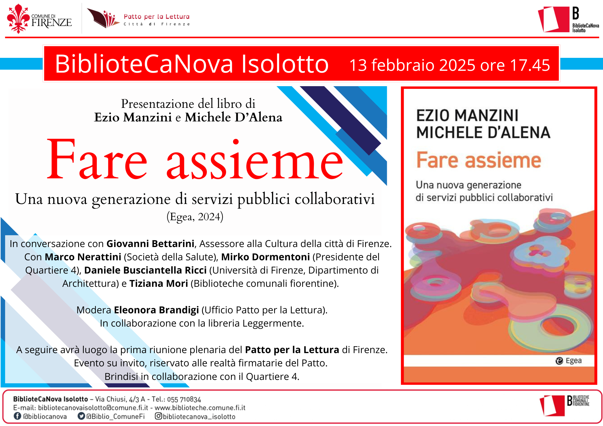 In conversazione con Giovanni Bettarini, Assessore alla Cultura della città di Firenze. Con Marco Nerattini (Società della Salute), Mirko Dormentoni (Presidente del Quartiere 4), Daniele Busciantella Ricci (Università di Firenze, Dipartimento di Architettura) e Tiziana Mori (Biblioteche comunali fiorentine). Modera Eleonora Brandigi (Ufficio Patto per la lettura). In collaborazione con la libreria Leggermente. La presentazionde del libro è aperta a tutti senza necessità di prenotazione