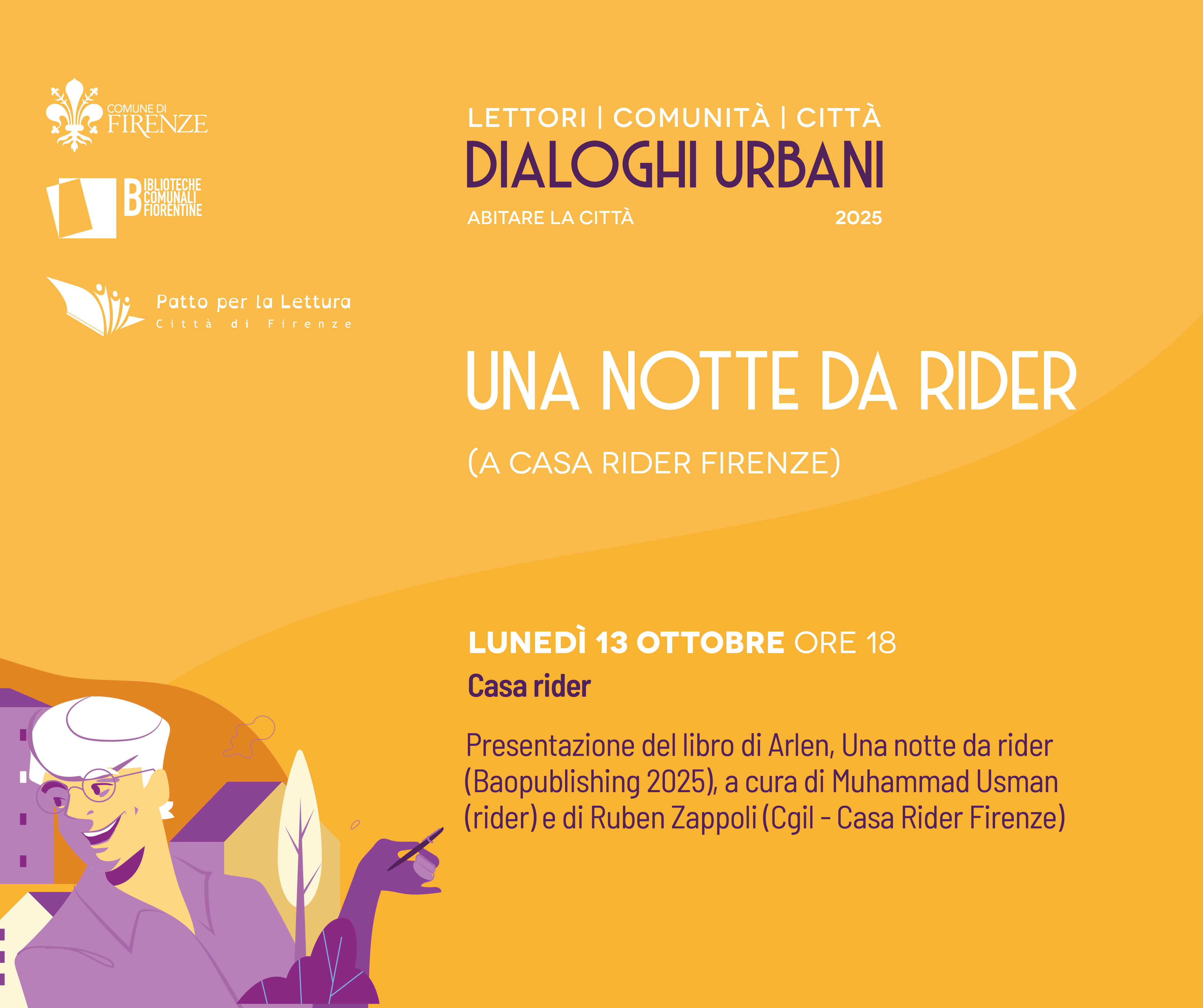 Lunedì 13 ottobre alle ore 18 a Casa rider in via Matteo Palmieri 11, presentazione del libro di Arlen, "Una notte da rider" (Baopublishing 2025) insieme a Muhammad Usman (rider) e di Ruben Zappoli (Cgil - Casa Rider Firenze).