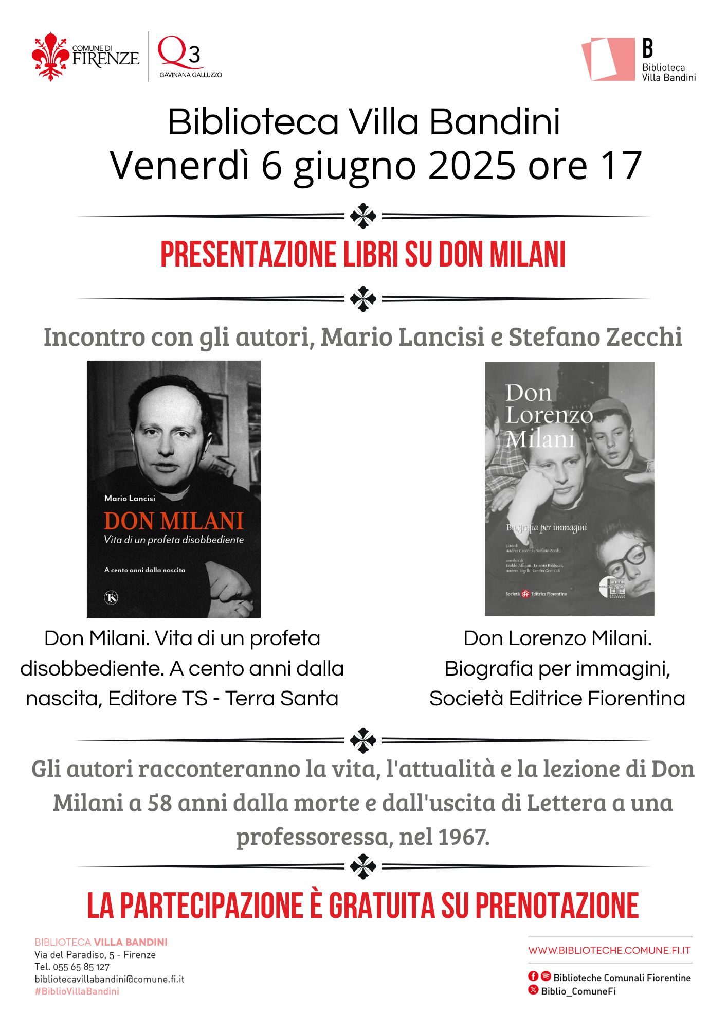 La partecipazione è gratuita su prenotazione. Per informazioni e prenotazioni telefonare al numero 055 6585127 oppure scrivere all’indirizzo bibliotecavillabandini@comune.fi.it