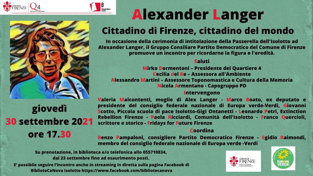 In occasione della cerimonia di intitolazione della Passerella dell'Isolotto ad Alexander Langer, il Gruppo Consiliare Partito Democratico del Comune di Firenze e Europa verde-Verdi promuovono un incontro per ricordarne la figura e l'eredità.