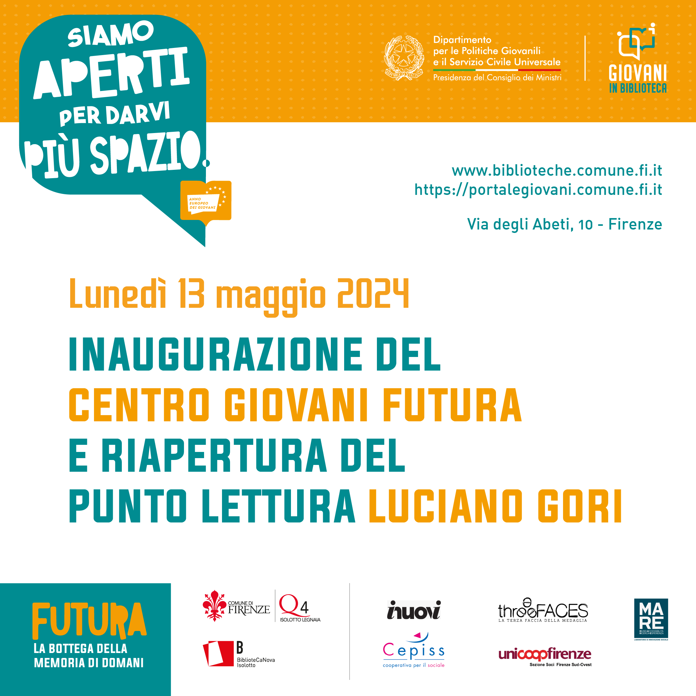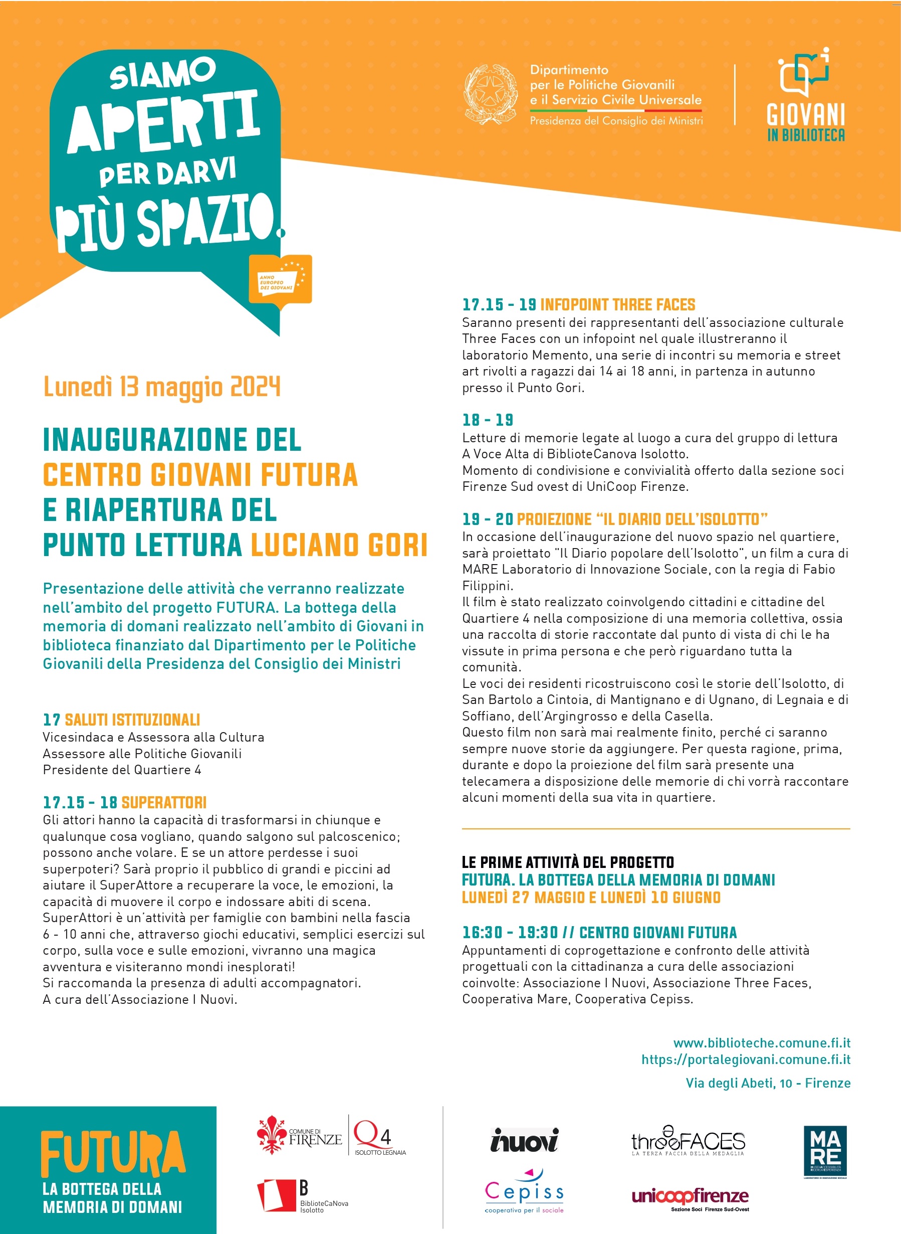 Programma dell’inaugurazione del Centro giovani Futura e riapertura del Punto lettura Luciano Gori e presentazione delle attività che verranno realizzate nell’ambito del progetto “FUTURA. La bottega della memoria”