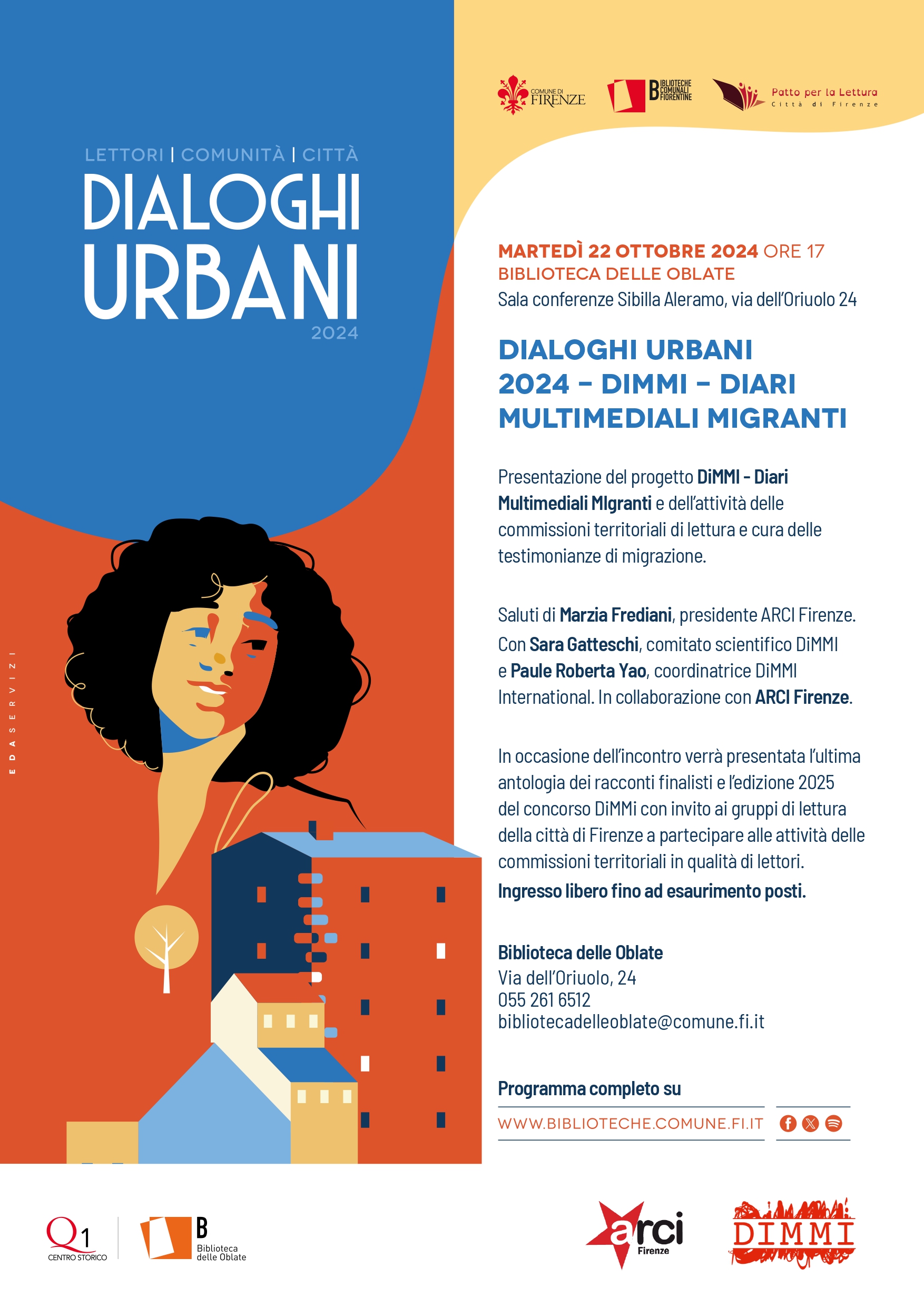 Nell'ambito della rassegna Dialoghi Urbani 2024, martedì 22 ottobre alle ore 17 nella Sala conferenze Sibilla Aleramo della Biblioteca delle Oblate si terrà la presentazione del progetto DiMMI - Diari Multimediali MIgranti e delle attività delle commissioni territoriali di lettura e cura delle testimonianze di migrazione.
