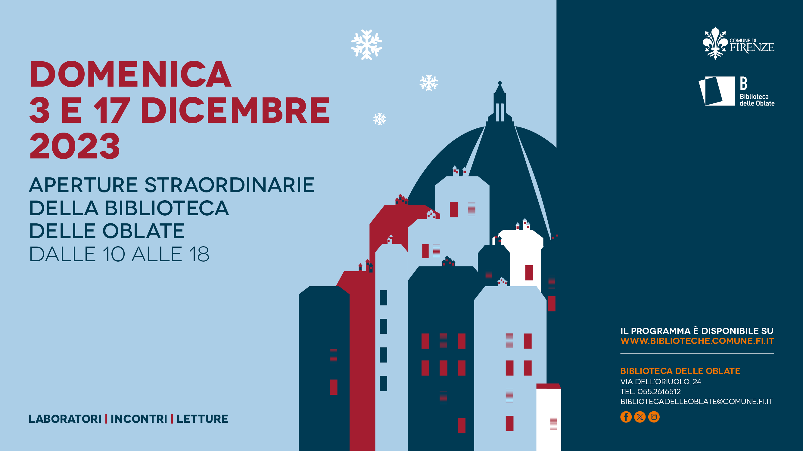 Tornano le aperture domenicali della Biblioteca delle Oblate, domenica 3 e 17 dicembre la Biblioteca sarà aperta per prendere in prestito libri, per studiare e partecipare alle letture e laboratori per bambini e per adulti.