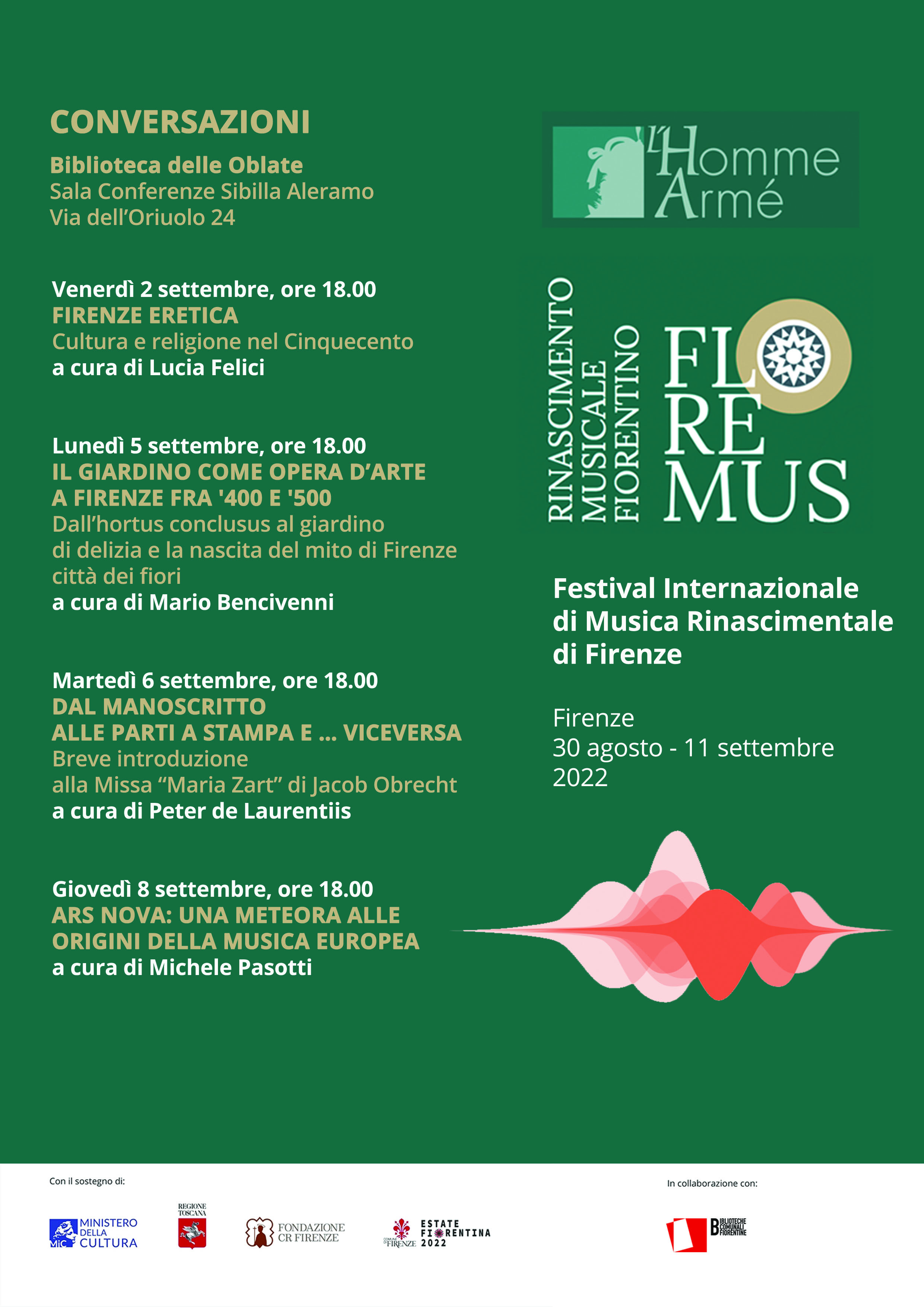 Anche quest’anno la manifestazione si articolerà in Concerti serali, Concerts à boire, Conversazioni e un Laboratorio, mentre si attende che la pandemia si plachi per riprendere i corsi che tanto successo ebbero nelle prime tre edizioni. La programmazione serale vede la presenza di alcuni dei gruppi europei più ricercati, come l’Ensemble Cinquecento (Austria, ma composto da artisti di varie nazionalità), la Cappella Pratensis (Olanda), ensemble di sole voci maschili specializzato nel repertorio rinascimentale), Alta bellezza (Svizzera), ensemble strumentale specializzato nel repertorio medievale e rinascimentale, L’Homme Armé, uno degli ensemble storici nell’ambito della musica antica in Italia e in Europa, per l’occasione con organico di 10 esecutori, La fonte musica (Italia), un ensemble fondato e diretto da Michele Pasotti, nato per interpretare la straordinaria stagione musicale di passaggio tra l’età medievale e quella umanistica, con particolare attenzione al Trecento italiano, ma che poi ha incluso il repertorio del Quattrocento e si è affermato in pochi anni come un gruppo fra i migliori nel panorama europeo.