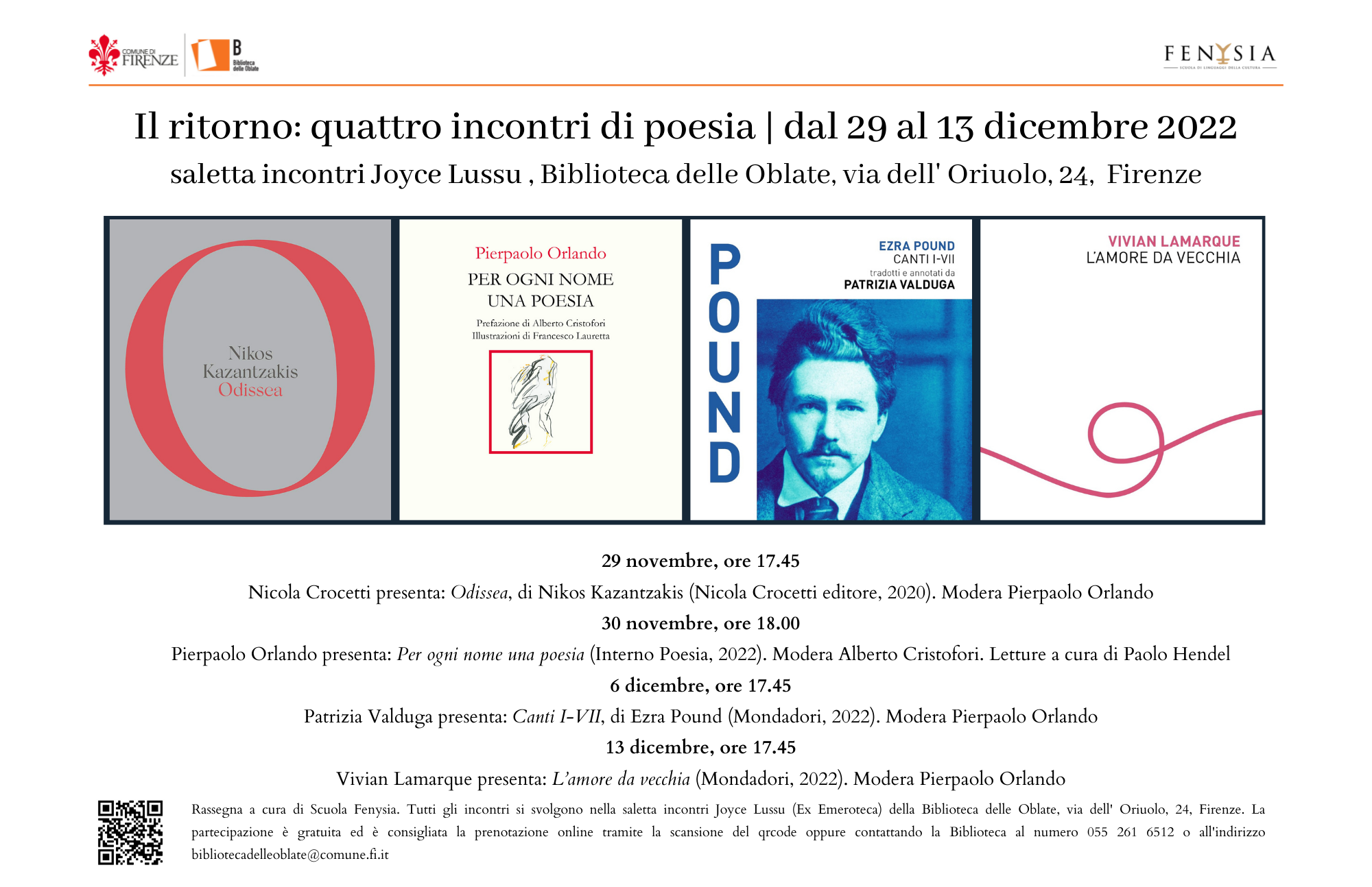 Dal 29 novembre Fenysia scuola di linguaggi della cultura continua il suo percorso di incontri e letture dedicati alla poesia alla Biblioteca delle Oblate.