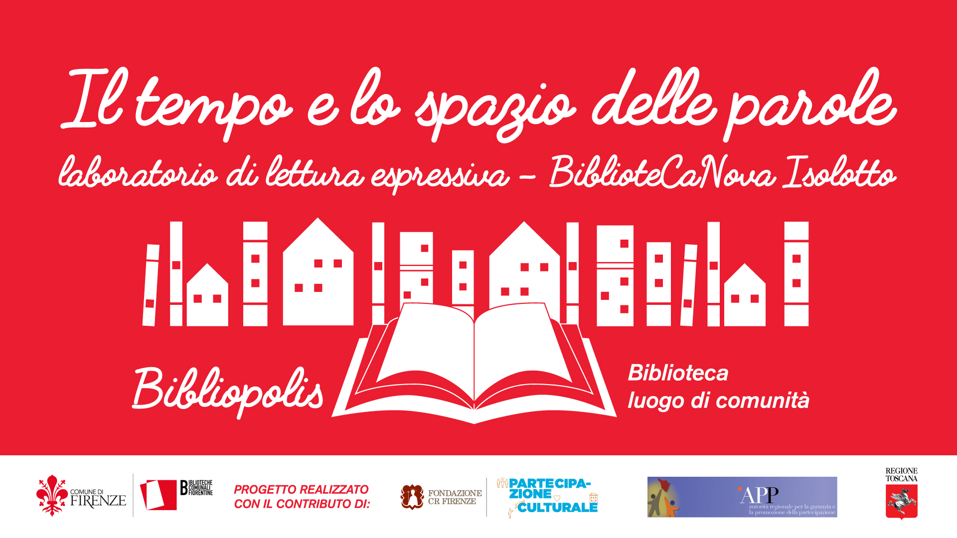 “Il tempo e lo spazio delle parole” fa parte del progetto “Bibliopolis, luogo di comunità” ed è realizzato grazie al contributo di Fondazione CR Firenze nell’ambito di “PARTECIPAZIONE CULTURALE”, il Bando tematico che la Fondazione dedica al sostegno di programmazioni culturali finalizzate a potenziare la partecipazione attiva della comunità locale e l’inclusione sociale delle periferie.