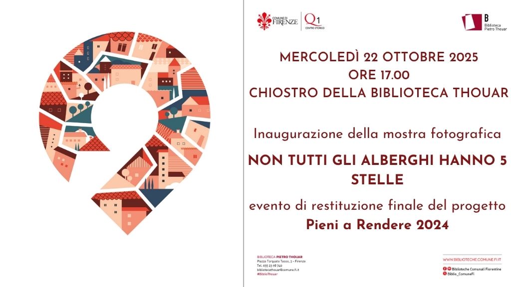 Mercoledì 22 ottobre 2025 alle ore 17.00, nel chiostro della Biblioteca Thouar inaugura la mostra fotografica “Non tutti gli alberghi hanno 5 stelle”. L’esposizione presenta le immagini raccolte da Silvia Palazzese e Lorenzo Bonosi (Associazione Giardino dell’Ardiglione), che hanno documentato il percorso narrativo e le interviste che compongono l’episodio dedicato a San Frediano. Volti, dettagli, spazi vissuti, scorci quotidiani: questi elementi visivi si affiancano alle parole degli abitanti, costruendo un racconto dove accoglienza, fragilità, memoria e convivenza diventano protagonista.
