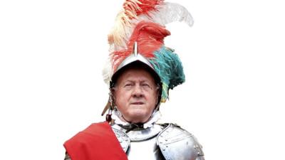 Il Capitano è protetto da borgognotta, armatura composta da gorgiera, pettorale, schienale, cosciali e bracciali interi con cubitiera.