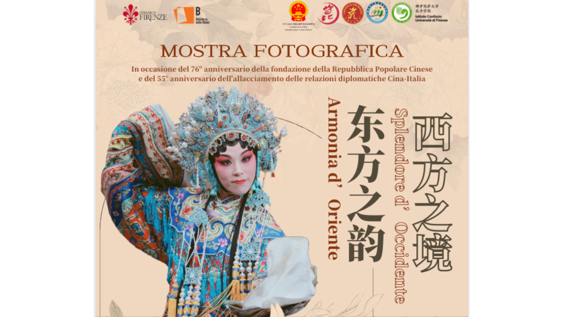 In occasione del 76° anniversario della fondazione della Repubblica Popolare Cinese e del 55° anniversario dell'inizio delle relazioni diplomatiche tra Cina e Italia, l'Istituto Confucio Università di Firenze organizza alla Biblioteca delle Oblate una mostra fotografica dal titolo Armonia d'Oriente Splendore d'Occidente.